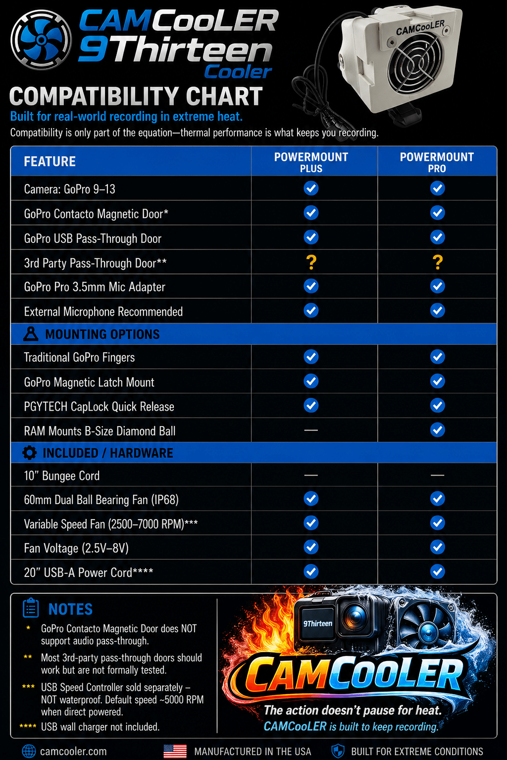 The CAMCooLER 9Thirteen is designed as an active cooling fan solution for the GoPro HERO9 Black, HERO10 Black, HERO 11 Black, HERO 12 Black, and HERO13 Black camera overheating issues when used in a static environment. This cooling fan will help keep your GoPro camera from overheating when recording sporting events, vlogging, creating YouTube content, as a dash cam, or in a small airplane!