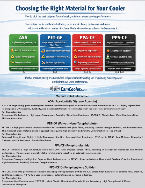 - For most customers, PET-GF (glass-fiber reinforced PET) is the best overall material choice. It delivers an excellent balance of heat resistance, strength, dimensional stability, and long-term durability, making it ideal for the majority of CAMCooLER applications.