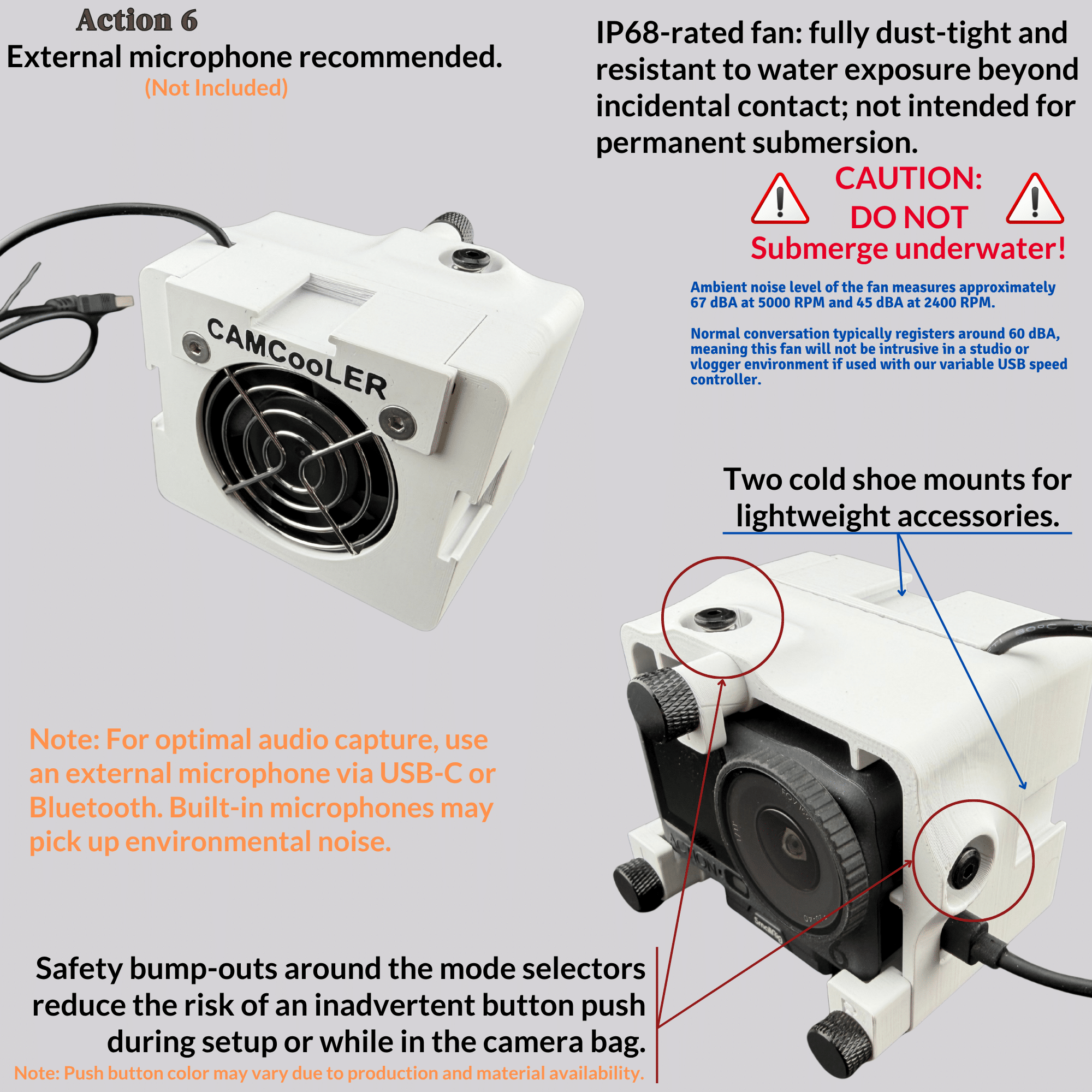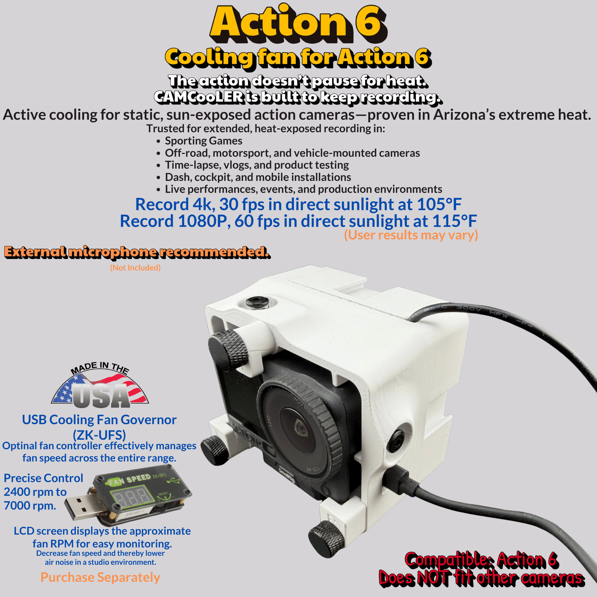 The CAMCooLER Action 6 is designed as an active cooling fan solution for the DJI Osmo Action 6 camera overheating issues when used in a static environment. This cooling fan will help keep your camera from overheating when recording sporting events, vlogging, creating YouTube content, and using it as a dash cam or in a small airplane!