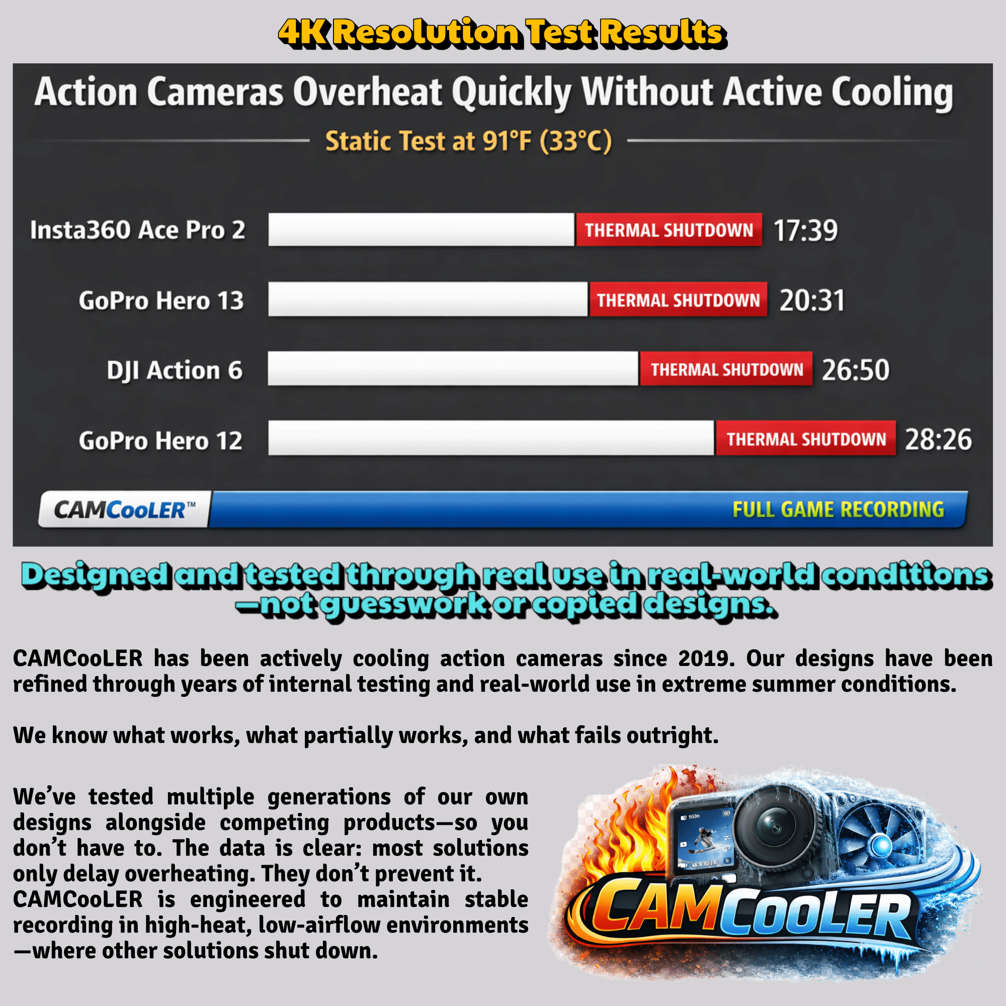 CAMCooLERs and Smartphone Coolers will help reduce your devices’ operating temperatures and keep them recording. However, due to various atmospheric conditions and/or camera conditions, we cannot guarantee that your device will not overheat and shut off. CAMCOOLERLLC will not be held responsible for lost recorded video footage due to an overheated device.