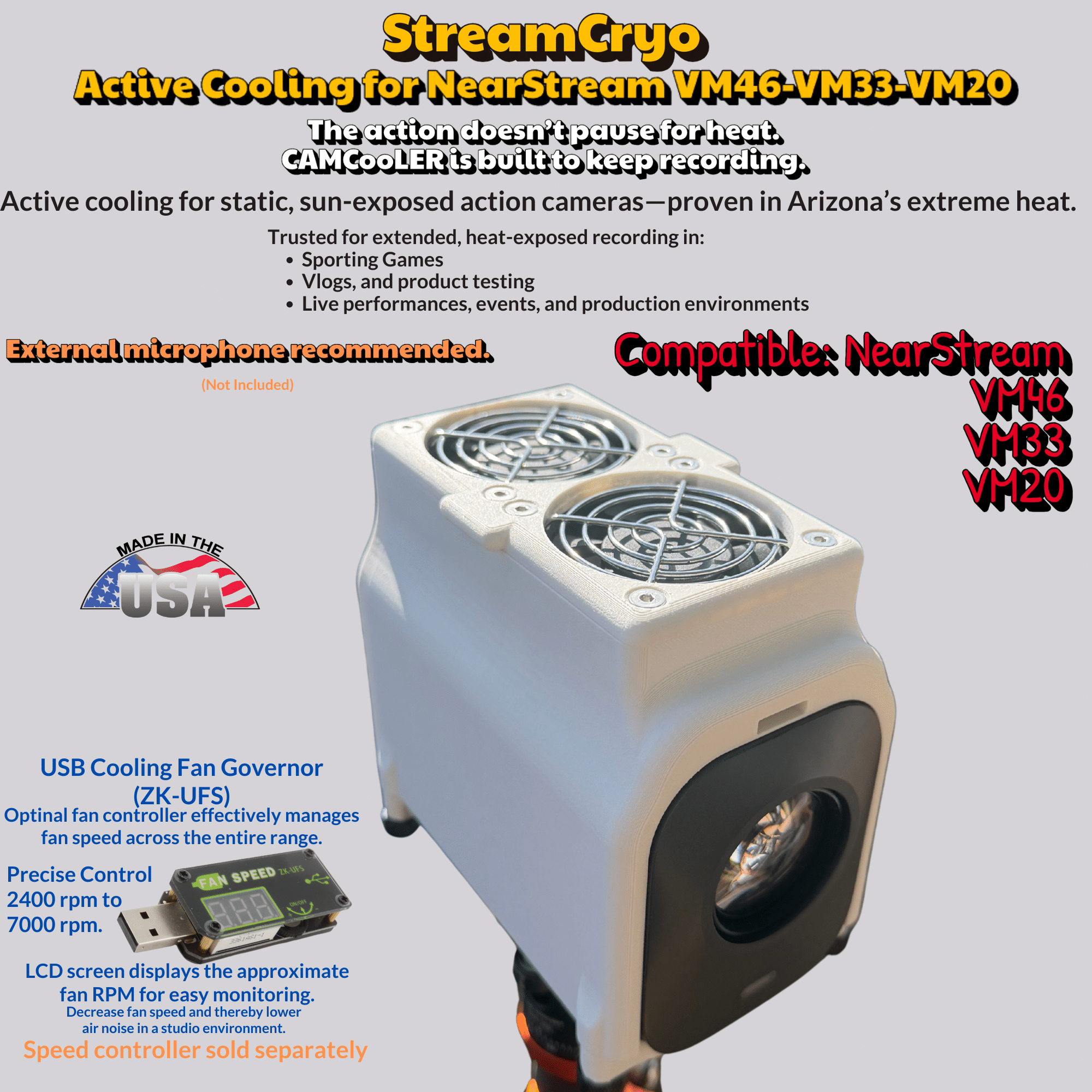 The StreamCryo is an active Cooling system for NearStream VM46,VM33, and VM20 cameras. It helps prevent camera overheating issues while recording and streaming live sporting events on GameChanger Team Manager or another streaming services.